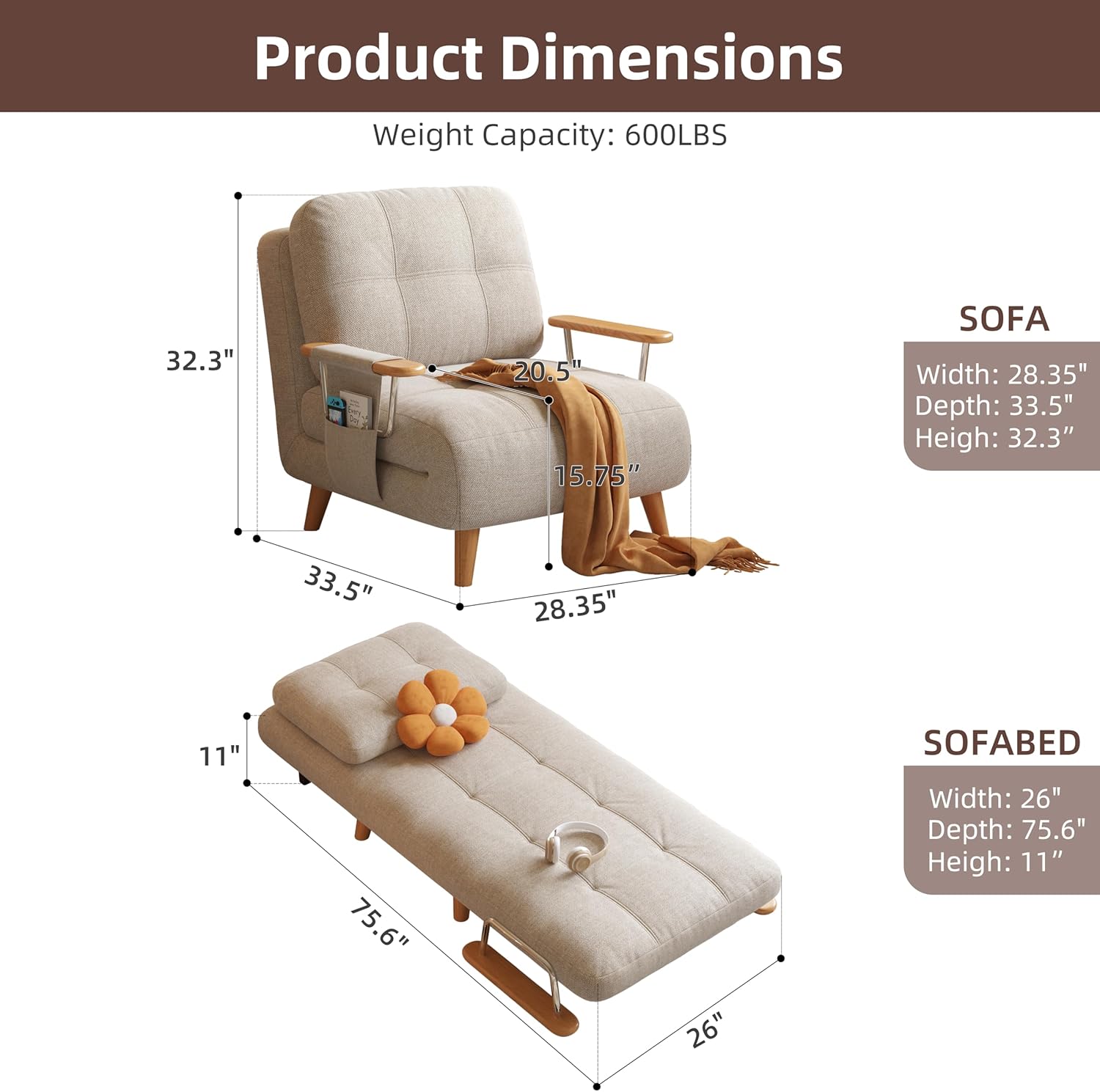 - Sofa Mode: 28.35” W x 33.5” D x 32.3” H