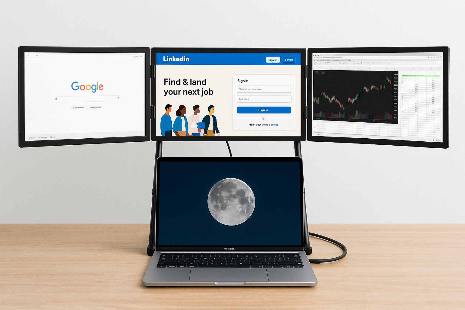 Triple your screen space with sleek, 1080p anti-glare monitors that fold out like magic. Perfect for work, gaming, trading & creative pros.